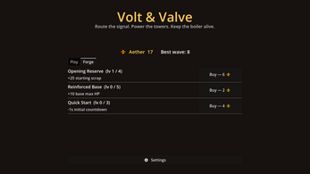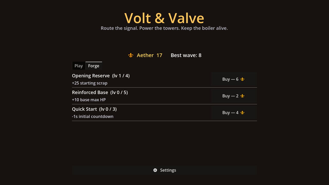 - Metaprogression — earn Aether per wave cleared; spend between runs in the Forge on permanent perks.