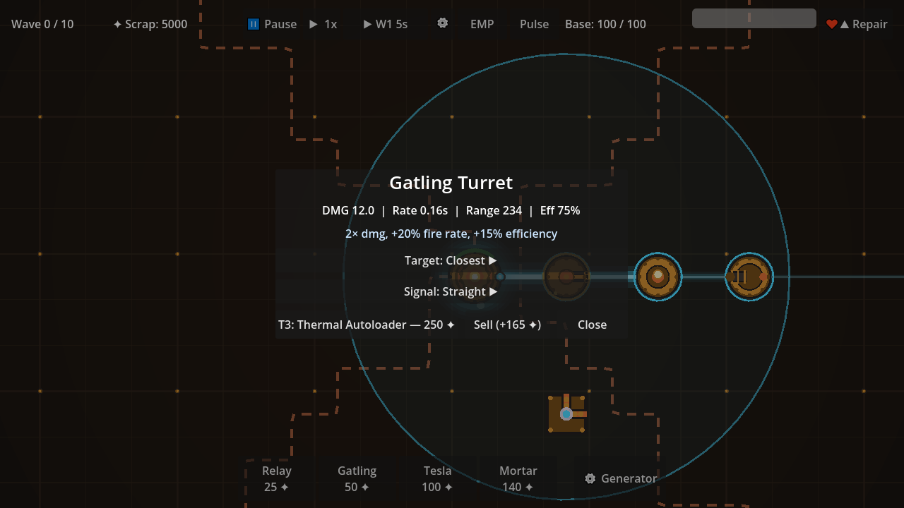 - Towers attenuate the beam. Instead of stopping the signal, a tower passes it through at reduced strength — downstream towers fire at proportionally less damage. Upgrade a tower's efficiency to feed a stronger signal onward.