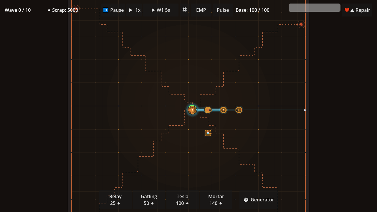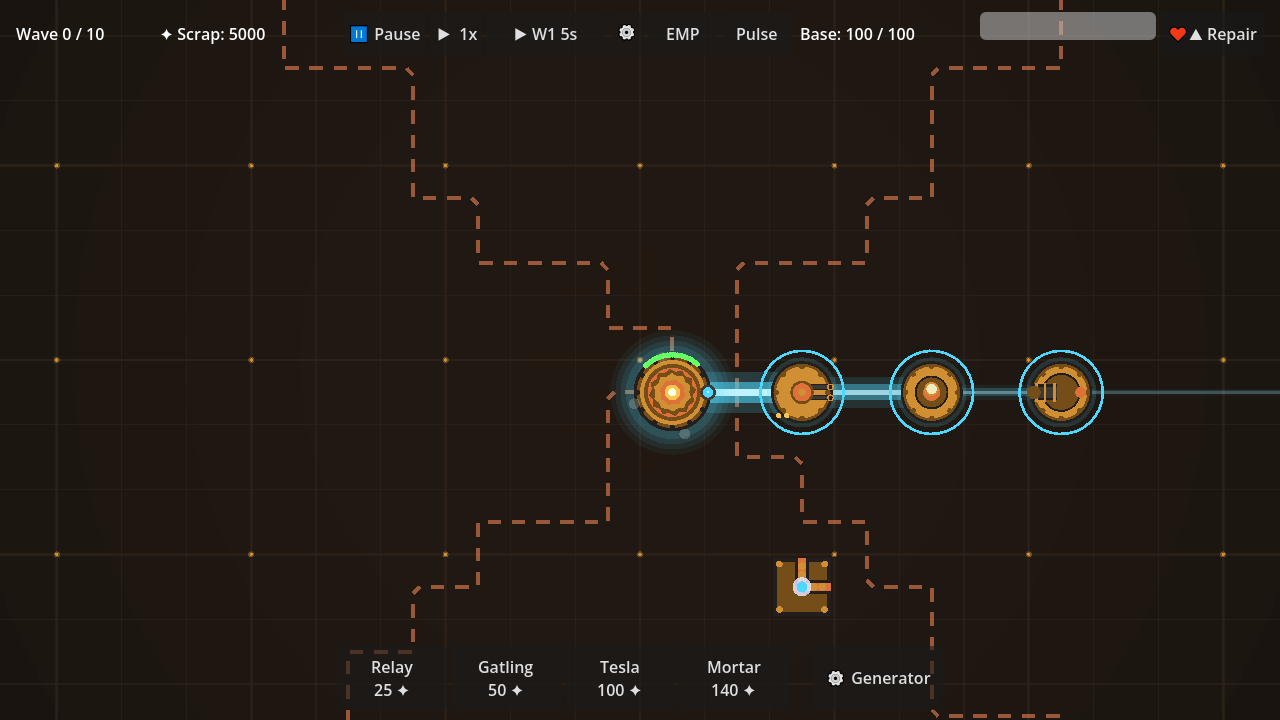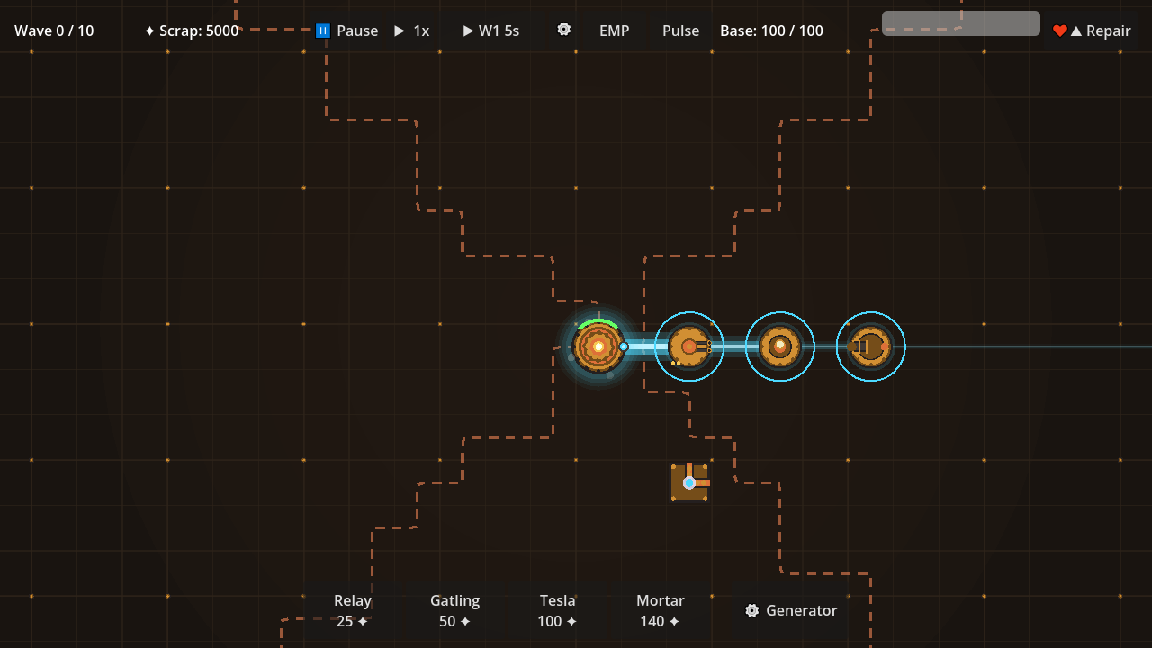 - Active abilities — targeted EMP (stun enemies in a radius) and Pulse (force-power every tower for 5 seconds).